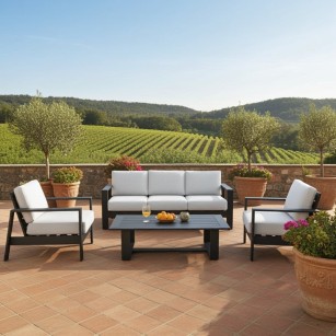 Conjunto BALTIC fabricado en aluminio barnizado al polvo (POLIÉSTER) . Cojines asiento y respaldo desenfundables con tejido repelente al agua ( OLEFIN 100% POLIPROPILENO).