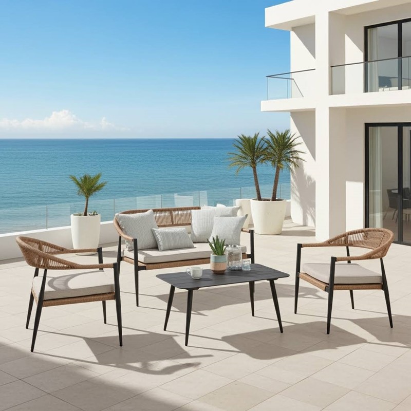 Conjunto JANDIA fabricado en aluminio barnizado al polvo (POLIÉSTER) . Cojines asiento y respaldo desenfundables con tejido repelente al agua ( OLEFIN 100% POLIPROPILENO) y trenzado de fibra sintética.