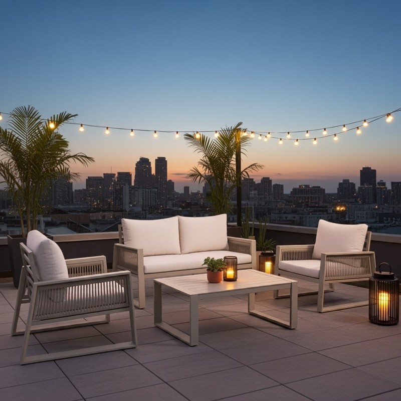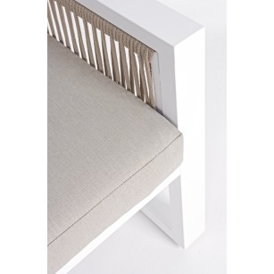 Conjunto CAPTIVA fabricado en aluminio barnizado al polvo (POLIÉSTER) . Asiento y trenzado de Texthilene. Cojines de asiento y respaldo desenfundables con tejido repelente al agua SPUN POLY (Poliester)