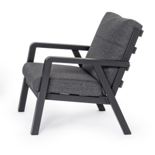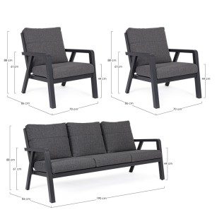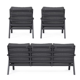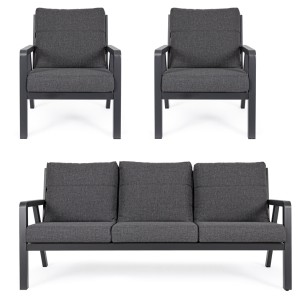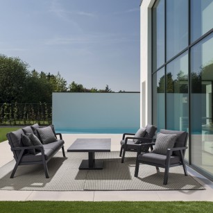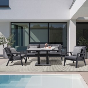 conjunto Truman con mesa elevable fabricado en ESTRUCTURA DE ALUMINIO BARNIZADO A POLVO (POLIÉSTER) color Antracita. COJINES DESENFUNDABLES CON TEJIDO REPELENTE AL AGUA OLEFIN (100% POLIPROPILENO). TORNILLERÍA DE ACERO INOXIDABLE. PARA MONTAR.