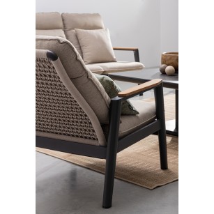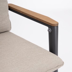 ESTRUCTURA DE ALUMINIO BARNIZADO A POLVO (POLIÉSTER)color Antracita. REPOSABRAZOS CON INSERCIONES DE TECA. RESPALDO (CON ENTRAMADO DE CUERDA OLEFIN), RECLINABLE EN POSICIÓN LIBRE Y ASIENTO DE TEXTILENE 1X1. COJINES DESENFUNDABLES CON TEJIDO REPELENTE AL AGUA OLEFIN (100% POLIPROPILENO). TORNILLERÍA DE ACERO INOXIDABLE.