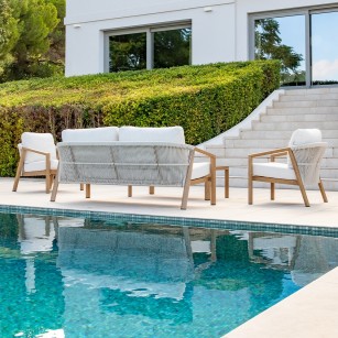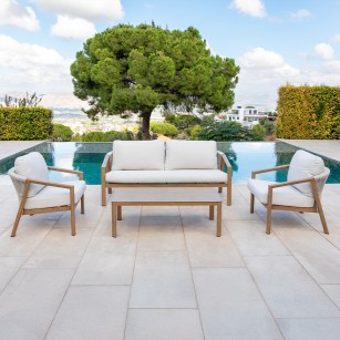 Set de aluminio imitación madera. Respaldo de cuerda sintética. Cojinería de olefina de 12cm de color beige. Tablero de mesa de aluminio imitación madera.