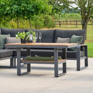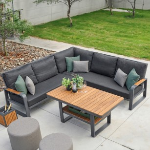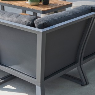 Conjunto Rinconera MONTANA fabricado en Aluminio blanco o Antracita. Cojinería Ivory soltex en color gris. Mesa de aluminio y teca. Detalle de teca en los reposabrazos.