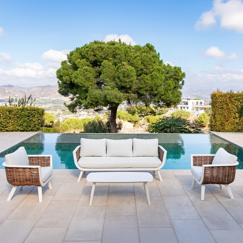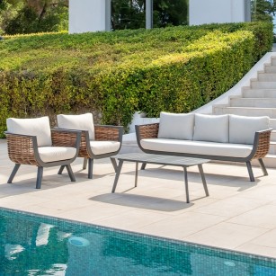 Set SUDAN compuesto por sofá 3 plazas + 2 sillones + mesa de centro. Aluminio blanco o Antracita. Respaldo y laterales trenzados con fibra sintética color natural. Cojinería de olefin de 12cm de grosor, color beige.