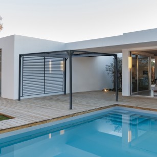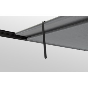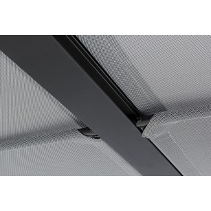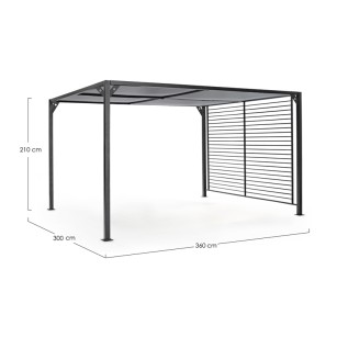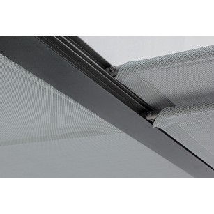 ESTRUCTURA DE ALUMINIO BARNIZADO A POLVO (POLIÉSTER). POSTED DE 65 X 65 MM, TECHO SUPERIOR DESLIZABLE DE TEXTILENE GRIS OSCURO.