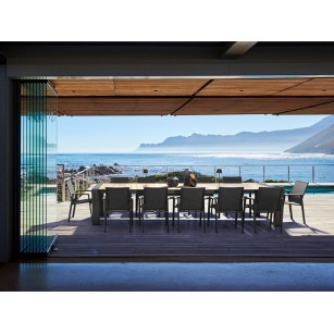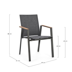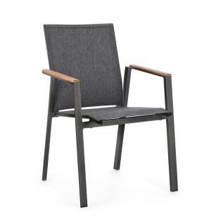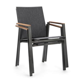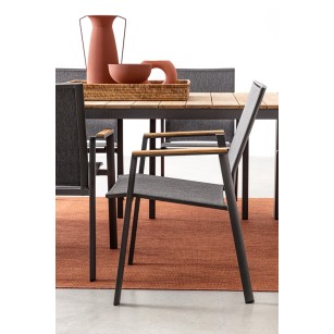 ESTRUCTURA DE ALUMINIO, BARNIZADO A POLVO (POLIESTÉR). REPOSABRAZOS CON INSERCIONES DE TECA. ASIENTO Y RESPALDO REVESTIDOS DE TEXTILENE PHIFER 1X1.