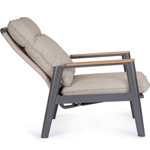 ESTRUCTURA DE ALUMINIO BARNIZADO A POLVO (POLIÉSTER). REPOSABRAZOS CON INSERCIONES DE TECA. RESPALDO (CON ENTRAMADO DE CUERDA OLEFIN), RECLINABLE EN POSICIÓN LIBRE Y ASIENTO DE TEXTILENE 1X1. COJINES DESENFUNDABLES CON TEJIDO REPELENTE AL AGUA OLEFIN (100% POLIPROPILENO). TORNILLERÍA DE ACERO INOXIDABLE.
