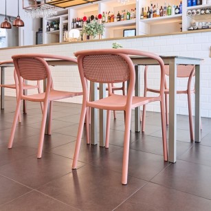 Sillon apilable NOON diseño de Hector Serrano para Ezpeleta fabricado en Polipropileno reforzado con fibra de vidrio. Inyección por gas. Tacos antideslizantes. 100% reciclable. Protección contra rayos UV. Válido para uso exterior e interior. Muy fácil de lavar y desinfectar. Producto de uso doméstico y público.