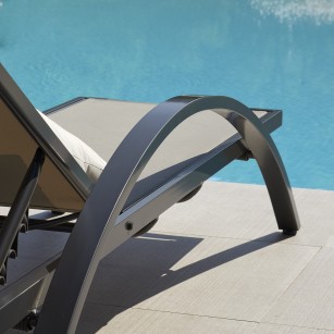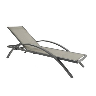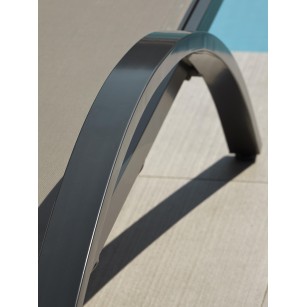 Tumbona para jardín COMFORT de aluminio apilable. Aluminio pintado por pulverización en gris oscuro con textilene gris claro. Peso neto: 8,70 kg. Reclinable en 6 posiciones.